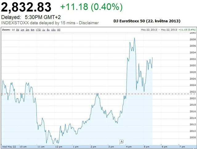 Evropským akciím se ve středu dařilo, posilovaly o více než 0,5 %, včetně britského burzovního indexu FTSE 100, který reagoval velice vlažně na nepříznivé údaje z maloobchodu. Maloobchodní tržby ve Spojeném království v dubnu zcela nečekaně meziměsíčně klesly o 1,3 %, přestože se čekal růst 0,1 % (v březnu -0,6 %). Jsou tak nejníže od dubna 2012. V meziročním srovnání vzrostly o 0,5 %. Za poklesem stál propad prodejů potravin, největší za poslední dva roky (-4,1 %), který naznačuje, že spotřebitelé stále utrácejí příliš málo. Britský FTSE 100 na to téměř nereagoval, až otevření amerických burz a řeč Bena Bernankeho ho poslaly nahoru. Připsal 0,53 % na 6 840,27 bodu.