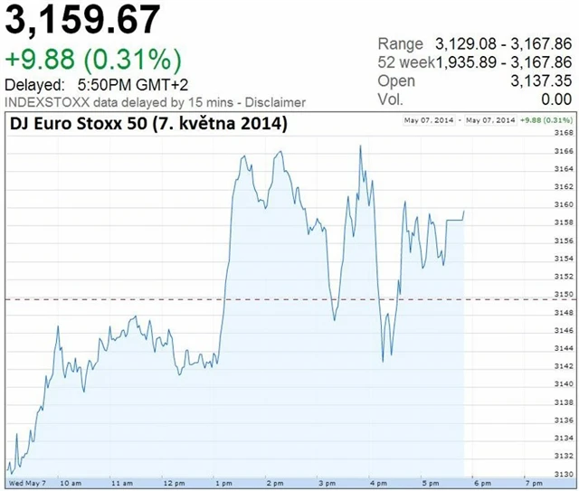 Britský FTSE oslabil o 0,03 %, německý DAX ale posílil o 0,57 % a francouzský CAC 40 vzrostl o 0,41 %. Jednotný evropský index DJ Euro Stoxx 50 nakonec uzavřel se ziskem 0,31 % na 3 159,67 bodu. Nejvíce se dařilo potravinářskému odvětví, sektoru základních materiálů a titulům z odvětví ropy a plynu. Oslabily naopak cenné papíry stavebních firem, automobilek a akcie ze sektoru finančních služeb.