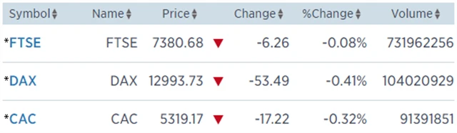 Regionální index STOXX Europe 600 odepsal 0,29 % na 383,8 bodu, za celý týden pak přišel o 1,26 %. Britský FTSE 100 klesl o 0,08 % na 7 380,68 bodu (za celý týden -0,67 %), francouzský CAC 40 ztratil 0,32 % na 5 319,17 bodu (za celý týden -1,14 %) a německý DAX spadl o 0,41 % na 12 993,73 bodu (za celý týden -1,02 %).