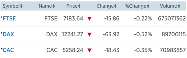 Regionální index STOXX Europe 600 odepsal 0,35 % na 374,82 bodu, za celý týden však vzrostl o 1,07 %. Britský FTSE 100 klesl o 0,22 % na 7 183,64 bodu (týden: +1,37 %), francouzský CAC 40 ztratil 0,35 % na 5 258,24 bodu (týden: +1,53 %) a německý DAX odevzdal 0,52 % na 12 241,27 bodu (týden: +1,19 %).