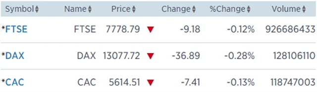 Regionální index STOXX Europe 600 odevzdal 0,3 % na 394,6 bodu, za celý týden však zpevnil o 0,86 %. Britský FTSE 100 přišel o 0,12 % na 7 778,79 bodu (týden: +0,82 %), francouzský CAC 40 klesl o 0,13 % na 5 614,51 bodu (týden: +1,44 %) a německý DAX odepsal 0,28 % na 13 077,72 bodu (týden: +0,87 %).