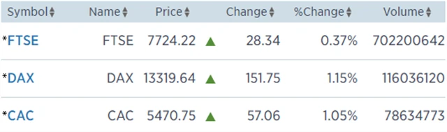 Regionální index STOXX Europe 600 stoupl o 0,93 % na 397,35 bodu, za celý týden pak vzrostl o 1,81 %. Britský FTSE 100 si připsal 0,37 % na 7 724,22 bodu (za celý týden +1,54 %) a během obchodování vystoupil na nový rekord 7 727,73 bodu. Francouzský CAC 40 získal 1,05 % na 5 470,75 bodu (za celý týden +1,91 %) a německý DAX si polepšil o 1,15 % na 13 319,64 bodu (za celý týden +1,89 %).