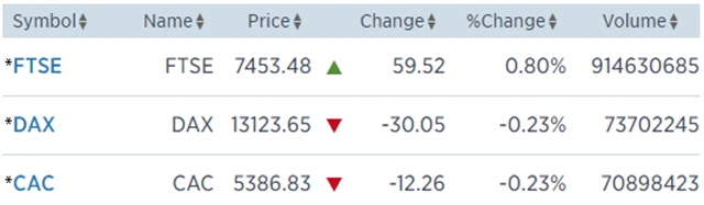 Regionální index STOXX Europe 600 po většinu seance kolísal mezi ziskem a ztrátou, nakonec odepsal 0,05 % na 389,05 bodu. Britský FTSE 100 zpevnil o 0,8 %, francouzský CAC 40 přišel o 0,23 % na 5 386,83 bodu a německý DAX ztratil 0,23 % na 13 123,65 bodu.