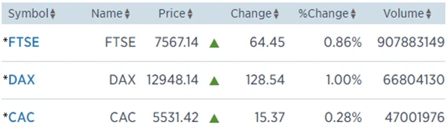 Regionální index STOXX Europe 600 zpevnil o 0,64 % na 389,5 bodu, britský FTSE 100 získal 0,86 % na 7 567,14 bodu, francouzský CAC 40 vzrostl o 0,28 % na 5 531,42 bodu a německý DAX přidal 1 % na 12 948,14 bodu.