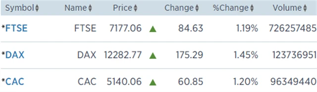 Regionální index STOXX Europe 600 vzrostl o 1,17 % na 372,93 bodu, britský FTSE 100 si polepšil o 1,19 % na 7 177,06, francouzský CAC 40 zpevnil o 1,2 % na 5 140,06 bodu a německý DAX získal 1,45 % na 12 282,77 bodu. Pozitivně v pondělí působil ziskový úvod seance na Wall Street, kde všechny tři hlavní benchmarky rostly o více než procento.