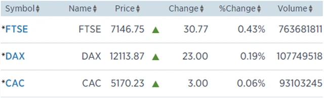 Regionální index STOXX Europe 600 zpevnil o 0,13 % na 371,37 bodu, britský FTSE 100 vzrostl o 0,43 % na 7 146,75 bodu, francouzský CAC 40 si připsal 0,06 % na 5 170,23 bodu a německý DAX získal 0,19 % na 12 113,87 bodu. Z pondělního poklesu se vzpamatoval index italských akcií FTSE MIB, jenž stoupl o 1,75 % na 22 202,5 bodu.