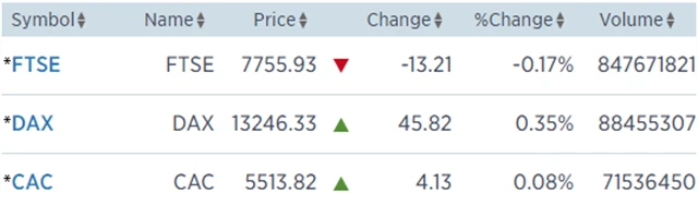 Regionální index STOXX Europe 600 si připsal 0,13 % na 398,35 bodu, britský FTSE 100 odepsal 0,17 % na 7 755,93 bodu, francouzský CAC 40 zpevnil o 0,08 % na 5 513,82 bodu a německý DAX stoupl o 0,35 % na 13 246,33 bodu.