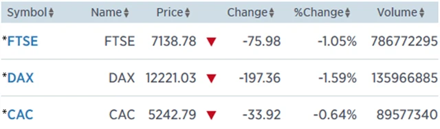 Regionální index STOXX Europe 600 spadl o 0,98 % na 375,47 bodu, britský FTSE 100 odepsal 1,05 % na 7 138,78 bodu, francouzský CAC 40 klesl o 0,64 % na 5 242,79 bodu a německý DAX ztratil 1,59 % na 12 221,03 bodu.