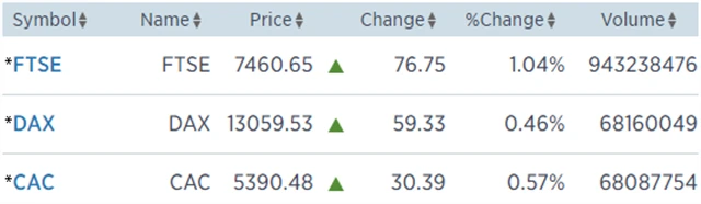 Regionální index STOXX Europe 600 zpevnil o 0,56 % na 387,02 bodu, britský FTSE 100 vzrostl o 1,04 % na 7 460,65 bodu, francouzský CAC 40 získal 0,57 % na 5 390,48 bodu a německý DAX si polepšil o 0,46 % na 13 059,53 bodu.
