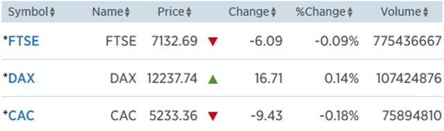 Regionální index STOXX Europe 600 klesl o 0,15 % na 374,94 bodu, britský FTSE 100 odepsal 0,09 % na 7 132,69 bodu, francouzský CAC 40 přišel o 0,18 % na 5 233,36 bodu a německý DAX zpevnil o 0,14 % na 12 237,74 bodu.