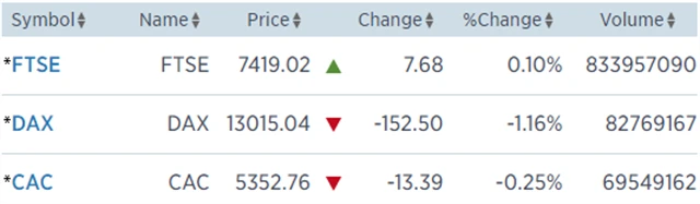 Regionální index STOXX Europe 600 odepsal 0,27 % na 387,06 bodu, britský FTSE 100 zpevnil o 0,1 % na 7 419,02 bodu, francouzský CAC 40 přišel o 0,25 % na 5 352,76 bodu a německý DAX klesl o 1,16 % na 13 015,04 bodu.