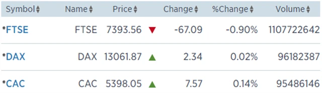 Regionální index STOXX Europe 600 vzrostl o 0,26 % na 388,04 bodu, britský FTSE 100 spadl o 0,9 % na 7 393,56 bodu, francouzský CAC 40 si připsal 0,14 % na 5 398,05 bodu a německý DAX zpevnil o 0,02 % na 13 061,87 bodu.