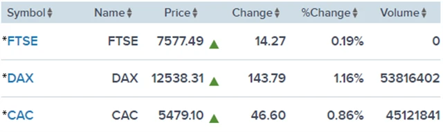 Regionální index STOXX Europe 600 zpevnil o 0,53 % na 385,59 bodu, francouzský CAC 40 získal 0,86 % na 5 479,1 bodu a německý DAX posílil o 1,16 % na 12 538,31 bodu. Ve Spojeném království se v pondělí neobchodovalo.