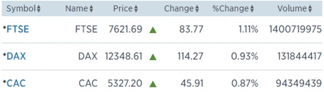 Regionální index STOXX Europe 600 stoupl o 0,68 % na 379,8 bodu, britský FTSE 100 získal 1,11 % na 7 621,69 bodu, francouzský CAC 40 vzrostl o 0,87 % na 5 327,2 bodu a německý DAX si polepšil o 0,93 % na 12 348,61 bodu.