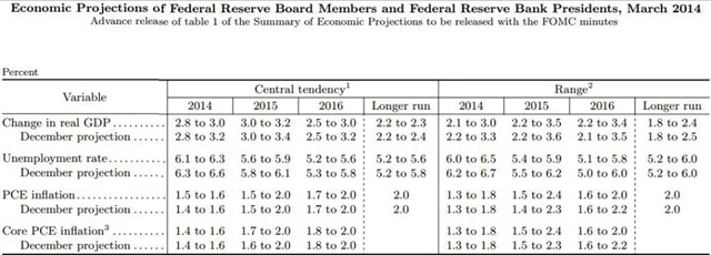 Měnový výbor na březnovém zasedání mírně snížil projekci HDP (viz tabulka). Proto prohlášení Janet Yellenové o tom, že se projekce a hodnocení ekonomiky od prosincového zasedání v podstatě nezměnilo, vyvolalo mezi novináři nepochopení. Server Zero Hedge její slova na Twitteru komentoval následovně: "Hodnocení ekonomiky je téměř identické prosincovým projekcím. Až na to snížení predikce růstu HDP."