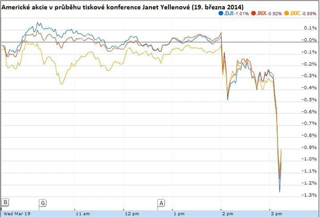 19.36 Yellenová: Pokud data budou ukazovat na zlepšování situace na trhu práce a zrychlování inflace, budeme dále pokračovat v omezování tempa nákupu dluhopisů. Nemáme však pevný rozvrh, o tom, jestli omezíme, nebo ne, budeme rozhodovat na každém zasedání FOMC.