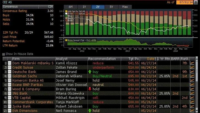 Na závěr nabízíme přehled investičních doporučení pro akcie ČEZ, jak je sesbírala agentura Bloomberg: