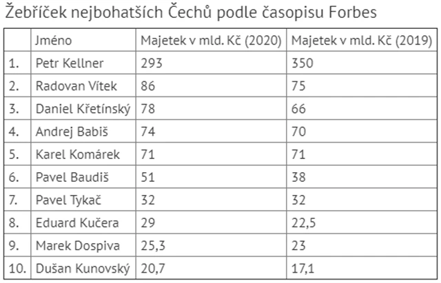 Babišův majetek Forbes odhaduje na 74 miliard korun, meziročně o čtyři miliardy více. Server upozornil, že premiér patří k vítězům koronavirové krize, protože zemědělství, potravinářství a hnojiva jsou mezi nejméně zasaženými obory. Babiš v roce 2017 vložil do svěřenských fondů holding Agrofert. Pátý je v žebříčku vlastník KKCG Karel Komárek, který mimo jiné ovládá Sazku. Jeho majetek je 71 miliard korun, tedy stejně jako loni, kdy to ovšem stačilo na třetí místo.