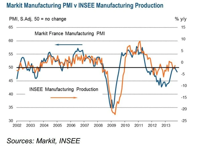 Index nákupních manažerů ve zpracovatelském průmyslu ve Francii nedopadl tak špatně, jak předvídala předběžná data. Sektor se dále propadl pod padesátibodovou hranici z říjnových 49,1 bodu na 48,4 bodu, předběžná data však počítala s pesimističtějším scénářem v podobě 47,8 bodu.