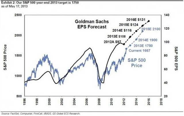 Goldman Sachs na začátku května prohlásila, že S&P 500 už dosáhl cíle, který mu předvídala na konci letošního roku, a svoje očekávání upravila. Dnes je upravila znovu. Hodnoty, kterou predikovala na konec roku 2015, S&P 500 prý dosáhne už příští rok.
