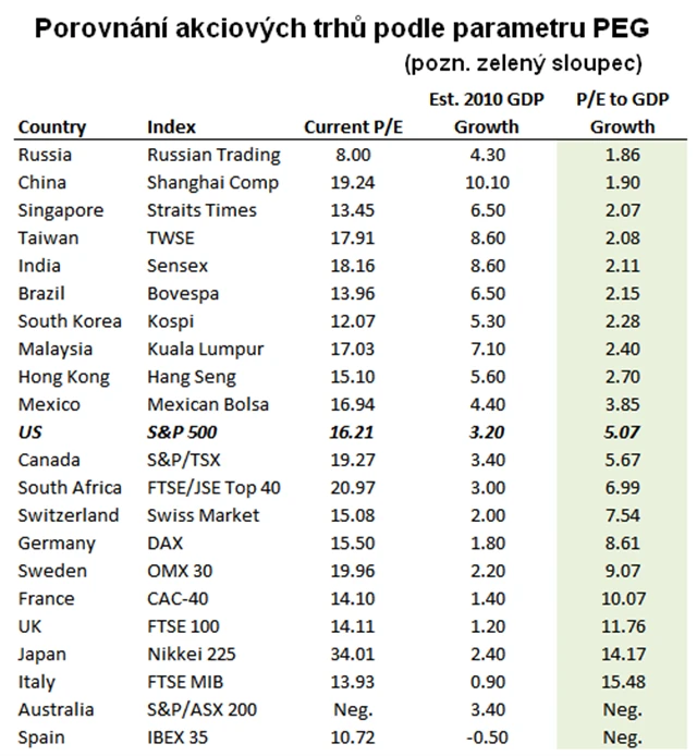 V přiložené tabulce je několik indikátorů. První P/E, který vyjadřuje poměr tržní ceny vůči ziskům společností obchodovaných na daném trhu. Dále odhadovaný růst ekonomiky (HDP) a poměrový ukazatel PEG, který dává do poměru P/E oproti růstu HDP. Obecně se dá říct, že čím je hodnota PEG nižší, tím se dá trh považovat za atraktivnější.
