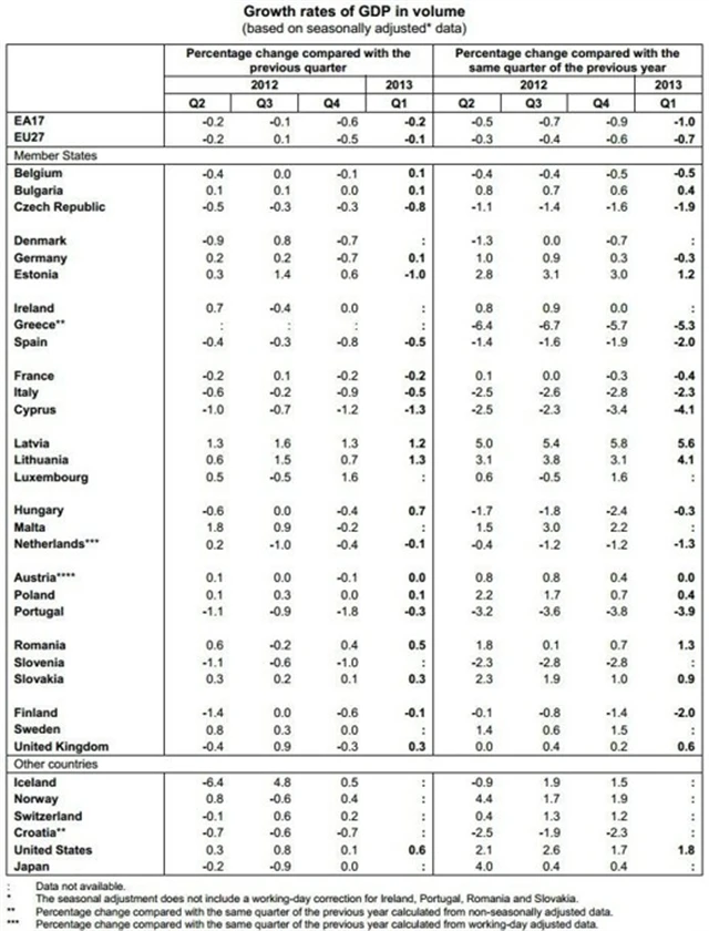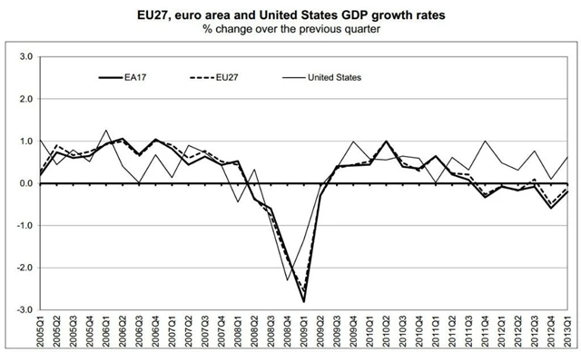 V prvních třech měsících roku bylo v recesi 9 ze 17 zemí eurozóny, na tento seznam se nově dostala Francie. Německo, které je největší ekonomikou unie, sice obnovilo mírný růst a recesi se těsně vyhnulo, to ale nestačilo vyrovnat pokračující propad zemí jižní Evropy zasažených dluhovou krizí.