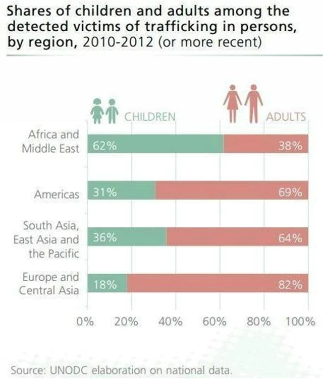 Téměř třetina odhalených lidí v obchodě s lidmi jsou podle zprávy Úřadu pro kontrolu drog a prevenci zločinnosti (UNODC) děti. V Africe a na Středním východě děti tvoří většinu obětí, v Evropě a Střední Asii jsou to většinou dospělí, zejména ženy.