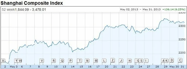 Index Shanghai Composite posílil v květnu o více než 6 %. S přehledem tak strčil do kapsy japonský Nikkei (zhruba na nule) i americký S&P 500 (před posledním obchodním dnem zatím v květnu +3,56 %).