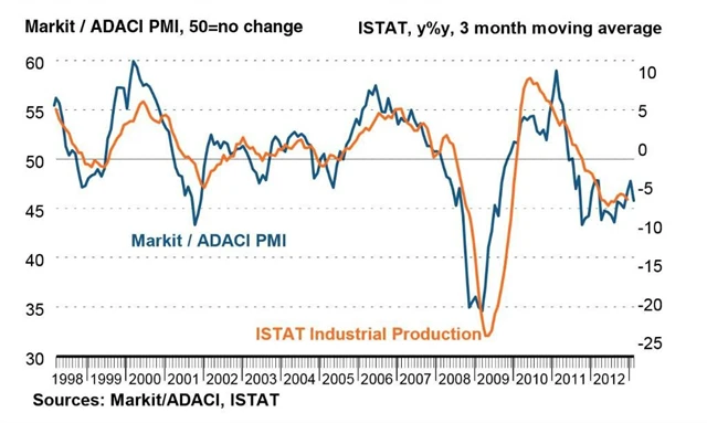 Editor internetového portálu Businessinsider.com Joseph Weisenthal tweetuje: "Reuters publikuje výsledky. Italský PMI mfg... 45,8. Mamma Mia!!!"