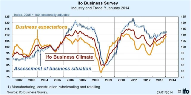 Nálada podnikatelů se podle institutu Ifo v lednu mírně zlepšila. Index podnikatelského klimatu stoupl na 110,6 bodu, očekával se mírnější růst na 110 bodů z prosincových 109,5 bodu. Hodnocení současné situace se také zlepšilo - indikátor vyskočil na 112,4 bodu z 111,6 bodu v prosinci. Budoucí očekávání vzrostlo na 108,9 bodu z prosincových 107,4 bodu, čekal se nárůst na 108 bodů.