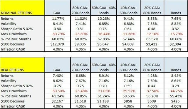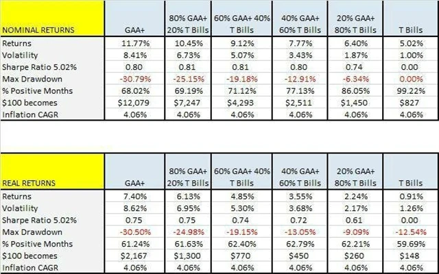 Níže je tabulka s výnosy (bez vlivu inflace i po odečtení inflace) při různých podílech akcií (ve formě globálního portfolia) a hotovosti (prezentované nástroji peněžního trhu, v USA známých jako T-bills) mezi roky 1973 až 2015.