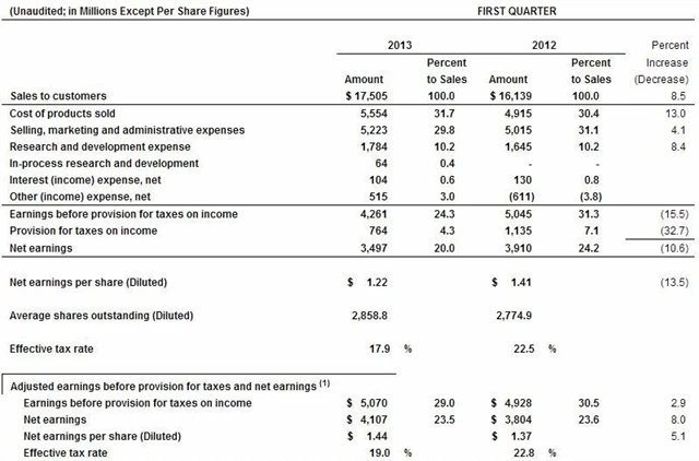 Čistý zisk na akcii činil 1,22 dolaru. Celkové tržby společnosti stouply o 8,5 % na 17,5 miliardy dolarů. Je to o něco více než 17,42 miliardy dolarů, předpoklad trhu.