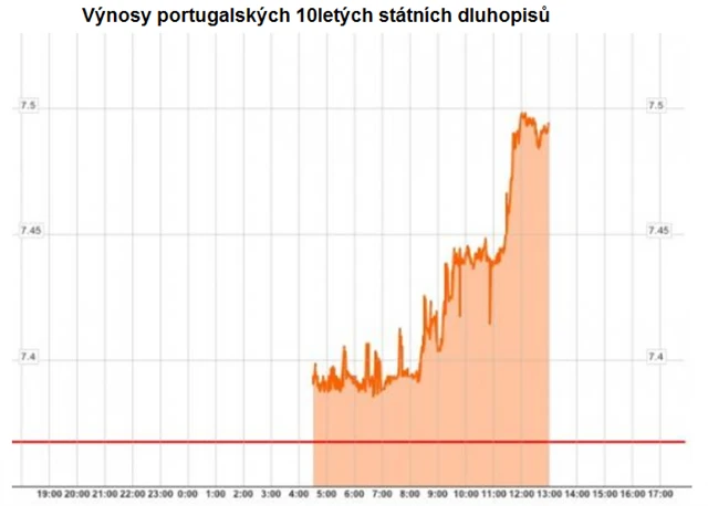 Výnosy portugalských státních dluhopisů vystřelily dramaticky nahoru. Důvodem je dnešní hlasování o rozsáhlých úsporných opatřeních. Ty se však nelíbí opozici, která tak ohrožuje další fungování vlády Josého Socratese, napsala svým klientům banka JPMorgan. Pravděpodobnost, že portugalská vláda tento týden padne a Portugalsko bude žádat o pomoc v rámci záchranného fondu, který vytvořila nedávo EU, je podle JPMorgan velmi vysoká.