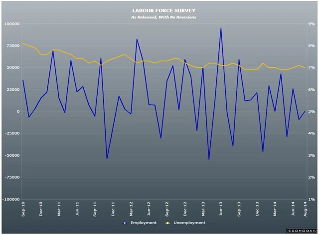 Celková míra nezaměstnanosti v Kanadě v červenci klesla o desetinu procentního bodu na 7 %. Čekala se stagnace na červnové úrovni. Míra participace klesla na 65,9 % z 66,1 % v červnu. Čekala se stagnace. Počet zaměstnaných lidí se v červenci změnil pouze nepatrně - přibylo jich 200.