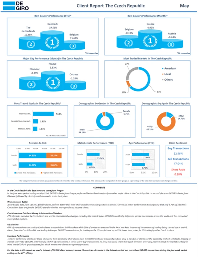 Nizozemský broker DEGIRO, který do České republiky zavítal před rokem a přinesl závan zdravé konkurence do boje o zákazníky mezi zavedenými českými brokery, před časem zveřejnil výsledky investování svých klientů. Z nich vyplývá, že byly v daném období ženy výrazně úspěšnější než muži, a to při zhruba stejném přístupu k riziku. Čeští klienti tohoto brokera zároveň více než ostatní Evropané chtějí investovat v USA.