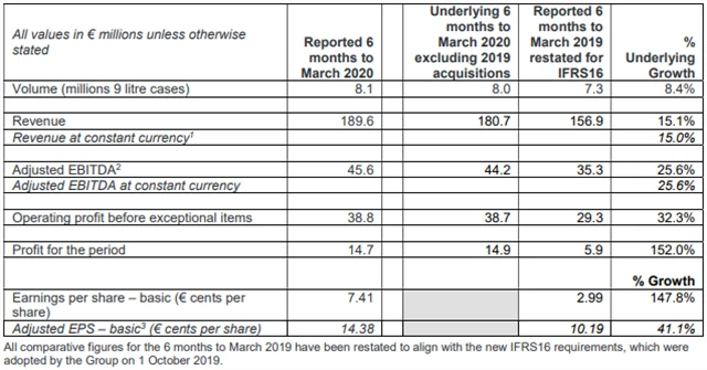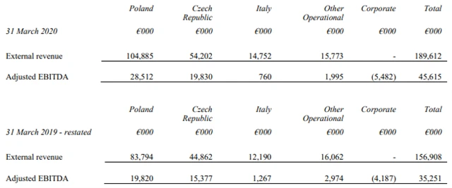 Upravený zisk EBITDA společnosti vzrostl na 45,6 milionu eur z 35,3 milionu eur. Zisk na akcii činil 7,41 centu po 2,99 centu a upravený zisk na akcii dosáhl 14,38 centu po 10,19 centu. Tržby společnosti stouply na 189,6 milionu eur ze 156,9 milionu eur a provozní zisk činil 38,8 milionu eur po 29,3 milionu eur v prvním pololetí finančního roku 2019. Prodejní náklady v prvním pololetí finančního roku stouply na 31,35 milionu eur z 27,84 milionu eur.