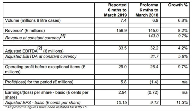 Tržby společnosti stouply o 8,2 % na 156,9 milionu eur a provozní zisk dosáhl 29 milionů eur (+9,7 %). Prodejní náklady likérce v prvním pololetí finančního roku stouply o 2,9 % na 28,9 milionu eur.