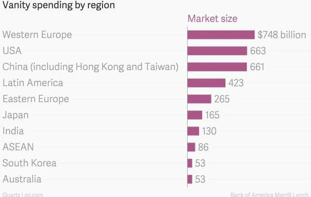 V absolutních číslech nicméně vedou se značným náskokem lidé ze západní Evropy, které jejich marnivost ročně vyjde na 748 miliard dolarů. Až druhé skončily Spojené státy a Čína (včetně Hongkongu a Tchaj-wanu) je třetí.