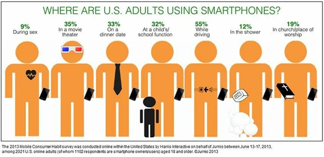 Pocit potřeby neustálého spojení s okolním světem během pracovního dne lze ještě pochopit. Znepokojující však je, že bez mobilního signálu nebo připojení k internetu někteří z nás nemohou vydržet ani ve chvílích volna. Během řízení automobilu podle nedávného výzkumu společnosti Harris Interactive telefon pravidelně používá 35 % Američanů. V kině odvrací od plátna k displeji mobilu zrak až 35 % lidí a na romantické večeři se kontroly telefonu nedokáže vzdát 33 % mužů a žen. Přibližně 32 % lidí si s telefonem v ruce krátí školní vystoupení svých dětí a 19 % Američanů shledává mobilní telefon zajímavějším než mši v kostele. Na posledním místě v seznamu neobvyklých míst pro používání mobilního telefonu skončila sprcha, do které se za zvuku hudby ze svého mobilu pravidelně odebírá 19 % žen a mužů.