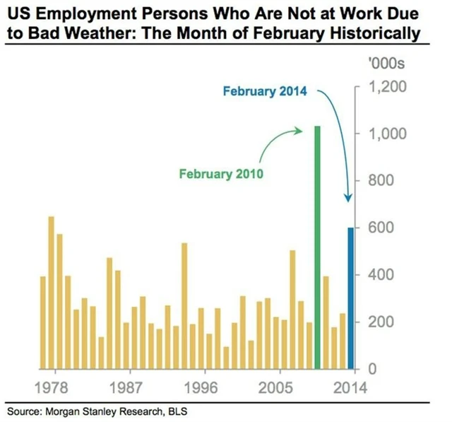 "Kdyby toto investorům nestačilo jako důkaz dopadu počasí na ekonomiku, ekonomové analyzovali počet zmínek o počasí v Béžových knihách Fedu za poslední dva roky. Zjistili, že zatímco v roce 2013 se slovo počasí objevilo v Béžové knize v lednu třikrát a v únoru osmnáctkrát, letos to bylo 21 a 119krát," konstatuje Hornbach.