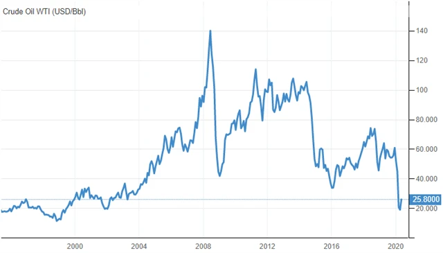 Ropa WTI (USD/barel), zdroj: Trading Economics