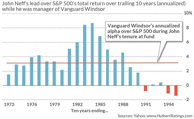 Jak je ale patrné z následujícího grafu, Neffovi se dařilo hlavně v prvních třech čtvrtinách jeho 31letého působení v čele fondu. Od poloviny 80. let alfa fondu postupně klesala, až v 90. letech dokonce spadla do záporných hodnot.
