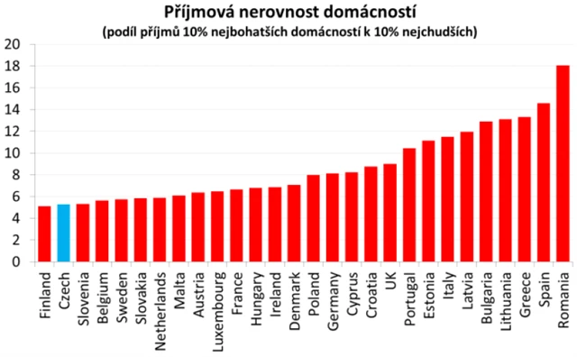 Jak je na tom Česko? Nejbohatší desetina domácností má zhruba pětkrát vyšší příjmy než nejchudších deset procent. V mezinárodním srovnání to ale není vysoké číslo. V Německu je příjem nejbohatších osmkrát vyšší, v Rumunsku dokonce osmnáctkrát. Společně s Finskem a Slovinskem máme v Česku nejnižší příjmovou nerovnost v celé EU.