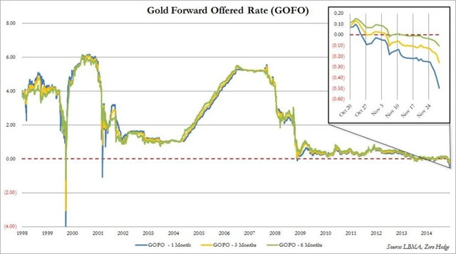 Jak konstatovali analytici z Deutsche Bank, "investoři jsou ochotní platit za to, aby si mohli půjčit zlato, což je netradiční, protože zlato bývá tradičněji používáno jako záruka proti hotovosti". Podle Deutsche Bank by za tímto stavem mohlo být mnoho faktorů od přebytku dolarové likvidity až po zvýšenou ochotu se jistit proti vývoji na globálním trhu.