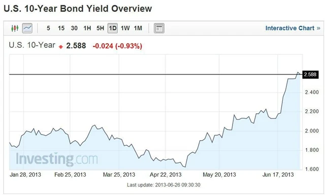 Výnos desetiletých amerických státních dluhopisů od začátku května prudce vzrostl z 1,6 % na 2,6 %, nahoru ho táhly především obavy z toho, že Fed utáhne kohoutky a přestane tisknout peníze. Ben Bernanke však po zasedání FOMC zopakoval, že Fed program nákupu dluhopisů neukončí minimálně do příštího roku, přestože už letos ho možná začne utlumovat.