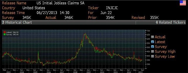 Počet nových žádostí o podporu v nezaměstnanosti v týdnu končícím 22. června klesl na 346 tisíc. Ekonomové očekávali pokles na 345 tisíc.