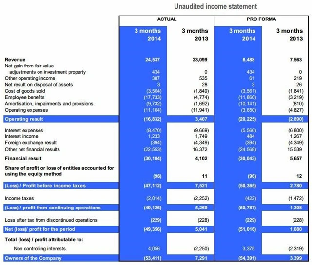 Developerská společnost Orco Property Group vykázala v prvním čtvrtletí čistou ztrátu 54,391 milionu eur. Hlavním důvodem je ztráta kontroly nad německou dceřinou společností GSG Group, dříve známou jako Orco Germany, uvedla firma. Provozní ztrátu Orco Property Group v období od ledna do března meziročně prohloubila na 20,225 milionu eur z 2,890 milionu eur. Tržby společnosti meziročně vzrostly na 8,488 milionu eur z 7,563 milionu eur. Na úrovni EBITDA společnost zůstala ve ztrátě 2,002 milionu eur (1Q2013: ztráta 2,106 milionu eur).