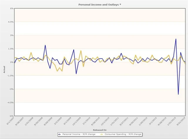 Osobní spotřeba ve Spojených státech v dubnu proti očekávání ekonomů o 0,2 % klesla, poprvé od května 2012, příjmy zůstaly víceméně nezměněné, přestože se čekal mírný růst. Březnové údaje byly negativně revidovány ve spotřebě z +0,2 % na +0,1 %. Březnové údaje o osobních příjmech byly naopak revidovány směrem nahoru z +0,2 % na +0,3 %.
