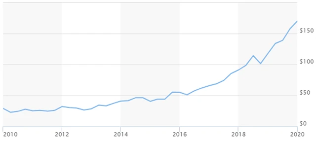 Vývoj ceny akcií Microsoftu na burze Nasdaq (v USD)