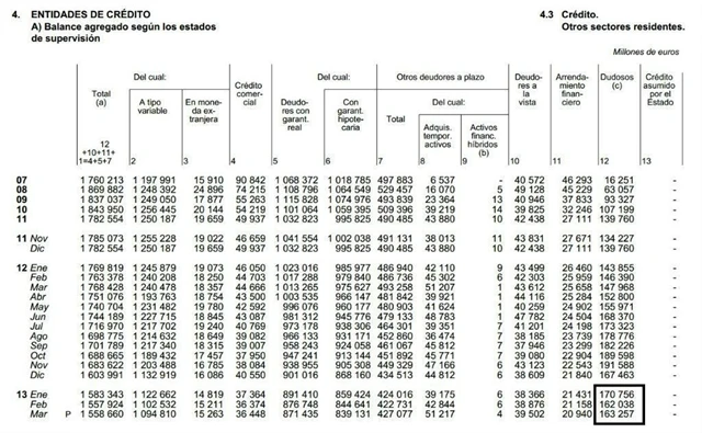 Španělská centrální banka v pátek oznámila, že nesplácené úvěry bankám dosáhly v březnu na 163,3 miliardy eur oproti únorovým 162 miliardám eur. Stále se však jedná o mnohem lepší výsledek než v lednu (171 miliard eur).